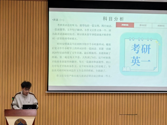 会上,学院特邀考研成功的李梦瑶、周承烨两位优秀学长进行经验分享,为同学们带来干货满满的备考指南。两位学长以高分实战经历为蓝本,从各科复习时间规划、真题多刷技巧,到规律作息培养、远离短视频干扰的高效学习法。着重强调英语和政治的重要性及备考方法,介绍了考研英语、政治的题型,分享备战过程,并提出了避坑指南。复试环节则详细拆解每一步骤,指导大家如何了解复试流程、准备事宜,帮大家提前规避复试误区,并详细讲解如何选择方向、课题组,同学们纷纷表示受益匪浅。