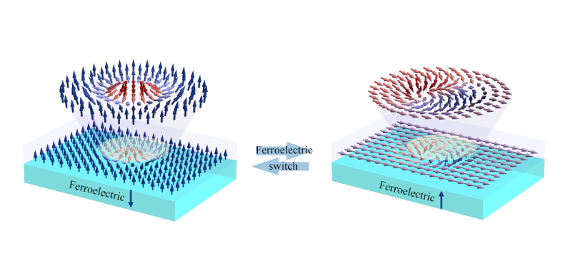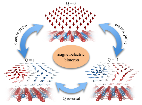进展一:对磁斯格明子和双半子等拓扑自旋态的精准调控是自旋电子学领域的重要课题。传统基于磁场调控的方法存在效率低、焦耳热效应显著等问题,而铁电调控展现出明显优势。然而,当前通过铁电手段实现对拓扑自旋结构的非平庸物性调控仍面临重要挑战。基于此,团队建立了一种新型磁电耦合机制,提出了“磁电双半子”这一新概念。根据对称性分析,发现铁电极化和DMI手性之间存在相互锁定效应,这将产生两种能量简并但手性相反的拓扑相。不仅如此,通过电场诱导铁电-反铁电相变,可以控制双半子的生成和湮灭。基于第一性原理与原子级自旋模拟,团队进一步证实了单层材料CuV2I6是实现磁电双半子的理想载体平台。本研究为电场调控拓扑自旋结构提供了新框架,为拓扑自旋电子器件设计提供了重要依据。相关研究成果以“Magnetoelectric Bimeron in Two-Dimensional Hexagonal Lattice”为题发表在Adv. Funct. Mater.国际期刊上。论文第一作者为2024级硕士生王修东,马衍东教授和戴瑛教授为共同通讯作者,山东大学为唯一作者单位。