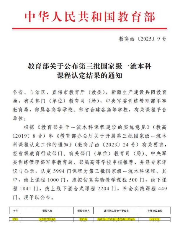 近日,教育部印发《教育部关于公布第三批国家级一流本科课程认定结果的通知》(教高函〔2025〕9号),正式公布第三批国家级一流本科课程名单。我院韩广兵老师负责的《大学物理实验Ⅰ》课程成功入选国家级线下一流本科课程。